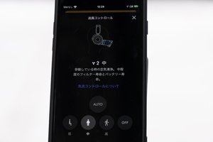非接触型シールドはマグネット式の着脱タイプで、装着後は口元からずらすことで会話モードに切り替え可能。空気清浄モードは低/中/高、そして装着者のコンディションに合わせて自動調整するAUTOの4モードを備える。AUTOモードの目安としては、静止時であれば「低」、ウォーキング時であれば「高」になるそうだ。