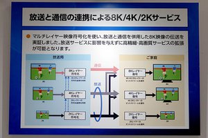会場では、8Mbpsの4Kレイヤーと1Mbpsの2Kレイヤーにサブコンテンツ的な1Mbpsの4Kレイヤーという3つのレイヤーを地デジ波で伝送するデモを披露。ここに通信も融合させ、もうひとつサブコンテンツ的な4Kレイヤーを送信するという活用方法を紹介している。マルチレイヤー符号化を使い、放送と通信を併用した8K映像の伝送も実証したという。