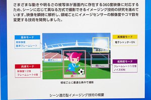 こうした撮影に対応するべく開発したのが「シーン適応型イメージング技術」。画面を272分割してエリア制御し、エリアごとに異なる解像度やコマ数が設定できるイメージセンサーが披露された。
