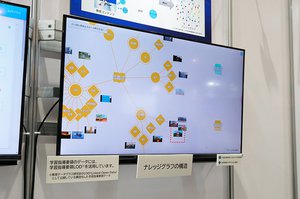 隣接ブースでは、Webベース放送メディアを活用したコンテンツとデータの連携・処理技術について展示。今回は、教育コンテンツから単語間の意味関係を抽出してグラフ構造化する「ナレッジグラフ」を活用し、各コンテンツを「学び」の観点で連携、よりユーザーに興味の広がりを提供するという試作システムが紹介されていた。