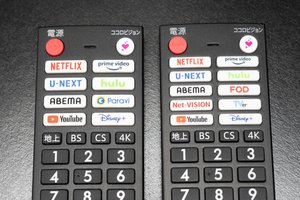 付属のリモコンも新しくなり、10種類の動画サービスにワンタッチでアクセスできるダイレクトボタンを搭載する。対応サービスは、Netflix、Prime Video、U-NEXT、Hulu、ABEMA、FOD、Net-VISION、TVer、YouTube、Disney+。ダイレクトボタンを押すだけで、テレビの電源がオフの状態であっても、動画サービスの視聴アプリをすぐ起動可能だ。またリモコンにはマイクが搭載されており、見たい番組を音声で検索できるほか、Googleアシスタントも利用できる。さらにFN1ラインのみ、ハンズフリーにも対応する。