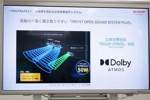 FN1/FN2ラインのスピーカーは、2個のトゥイーター/2個のミッドレンジ/1個のサブウーファーによる「FRONT OPEN SOUND SYSTEM PLUS」を採用。スピーカーネットがない独自設計のリフレクター構造により、音を効率的に画面前方に導くという。他方FL1ラインは、2個のフルレンジスピーカーを備える。なおスピーカーの合計出力は、FN1ラインが50W、FN2ラインが35W、FL1ラインが20W。いずれのモデルも、音響補正技術「Eilex PRISM」を搭載するほか、Dolby Atmos再生をサポートする。