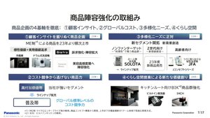 商品力強化の取り組みでは、まず顧客インサイト起点で実用価値を絞り込み、魅力ある商品を創出する。松下社長直轄の“社内マイクロエンタープライズ製”という、商品コンセプト構築から開発・上市までを職能横断チーム体制での開発体制を実現する。さらにグローバルでの原価力をあげ、普及価格帯からも逃げない商品陣容を強化する。