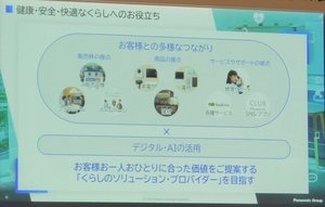 課題の2つめはくらし領域における、健康、安全、快適へのお役立ち。お客様とのつながりにデジタル技術を掛け合わせ、技術革新とビジネスモデルの変革を進める。そして個々が独立した状態を統合し、さらなるお役立ちにつなげる。デジタルやAIの活用により、1人1人にあった価値を提案する「くらしのソリューション・プロバイダー」を目指していく。「くらしの領域には、引き続きグループあげて取り組む」と、販売店活躍の領域に対する注力の姿勢を強調した。