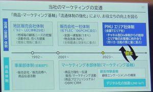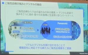 さらに、販売会社の体制変更についても紹介された。2000年以前のパナソニックでは、各事業部の営業部門が販売店に対する商品伝導活動を行い、販売会社が地域別に販売店を支える体制だったが、2001年以降は、パナソニック マーケティング本部が設立されマーケティング活動を行い、販売会社は一社体制で全国の販売店に対しての一律の施策を推進してきた。