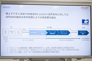 OPSODISの音声処理は付属の送信器内で行い、本体に送信する。具体的には、まずテレビから出力された音源に対して「バイノーラル変換処理」を行い、左耳・右耳用の最適な立体音源を作成。続いて左右のスピーカーの音が混じり合うことで生じる音声劣化を「クロストークキャンセル」により除去する。最後にスピーカーの指向特性と取付構造の影響を補正し、360度あらゆる方向から包まれるような音を再現している。