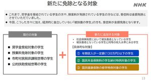 NHKでは、学生に対する受信料免除の基準拡大を10月から予定している。現在は、親元等が市町村民税非課税の世帯の学生などを受信料全額免除対象にしているが、社会保険で被扶養者となっている学生や、それと同等の収入水準にある学生も免除対象に加えるというものだ。