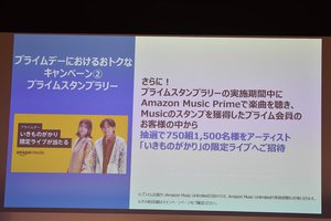 さらに、キャンペーン期間中にAmazon Music Primeで楽曲を聴き、Musicのスタンプを獲得したプライム会員の中から抽選で750組1,500人が「いきものがかり」の限定ライブに招待される。鈴木氏は「ぜひスタンプラリーへの参加を通して、限定ライブをお楽しみいただければ」と応募を呼びかけた。
