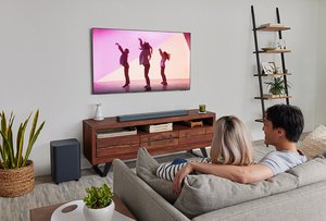 サウンドバー部には、2ウェイ構成のセンター左右用スピーカー5基のほか、両端にサラウンド用ビームフォーミングスピーカー2基、上位モデル「BAR 1000」と同じ出力となる300Wのハイパワーアンプを搭載した、250mm径の独立型ワイヤレス・サブウーファーがセットになり、計8基のドライバーユニット構成を実現。総合出力590Wのパワーで立体音響空間を創り出す。