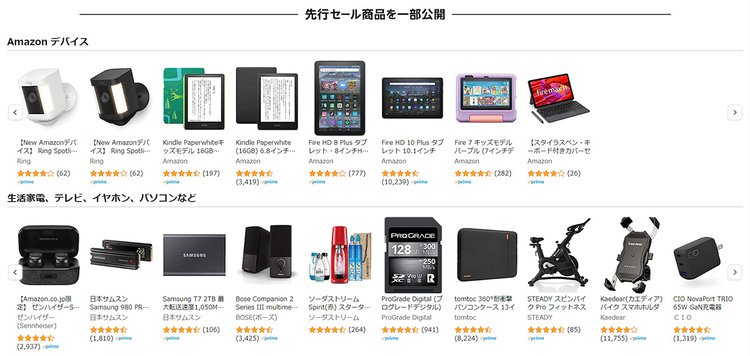 今回のプライムデー初の試みとして、プライムデー開始2日前となる7月9日(日)0時より、「プライムデー先行セール」を開催。こちらもセール対象の一部が公開されており、iPad(2021/10.2インチ)、ルンバi7+、ゼンハイザーの完全ワイヤレスイヤホン「MOMENTUM True Wireless 3」などがラインナップしている。