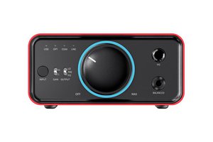 ほか、音質に悪影響を及ぼす電源ノイズを抑制するための独立電源供給回路や、112段階の微細な音量調整が行えるADCボリュームコントロール、2段階のハードウェアゲインなどを搭載。入出力端子として、前面に6.3mmステレオ/4.4mmバランスヘッドホン出力、背面にRCAライン出力/ライン入力、同軸デジタル/光デジタル入力、USB-B入力を備える。外形寸法は約120W×168H×55Dmm、質量は約610g。