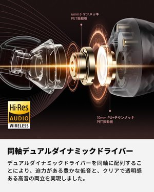 Engine 4ではダイナミックドライバーを同軸上に2基配置する「同軸・デュアルダイナミック型ドライバー」を採用。中低音域はPUにチタンメッキを施した3層構造からなる10mm PET複合振動板のダイナミックドライバー、高音域は同じくチタンメッキを施した6mmのPET振動板のダイナミックドライバーがそれぞれ担っている。