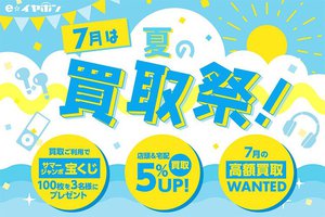 実店舗への持ち込み、宅配買取どちらも対象。買取利用で抽選で3名にサマージャンボ宝くじ100枚をプレゼントするほか、査定金額も最終査定よりさらに5%金額アップする。また、7月限定で高額査定を行うアイテムも設定される。高額買取の対象商品は別途ブログにて案内するという。