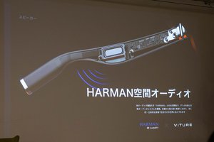 VITURE oneは、メガネのように掛けることで120インチ相当の大画面が目の前に現れるスマートグラス。レンズには有機ELを採用、スピーカーはハーマン社とのコラボによるもので、メガネのツルの部分左右に配置されている。(骨伝導ではなく耳のそばで音がなるもの)。