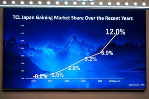 続いて、日本市場について「テレビ市場が現在急速に縮小傾向にあるなかでも、TCLの市場シェアは急速に伸びており、過去3年間において日本で最も急成長しているテレビブランドになった」とシェアを拡大。前四半期における市場シェアは12%に達し、日本市場でのテレビブランドでは第4位、輸入テレビブランドに限れば第1位を獲得したという。