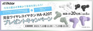 JVCケンウッドは、Victorの完全ワイヤレスイヤホン「HA-A20T」を抽選で20名にプレゼントするキャンペーンを、公式オンラインストア「JVCケンウッドストア」にて開始した。期間は7月19日(水)23:59まで。