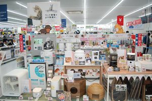 通路に面して目に飛び込んでくるのは、大きく展開する「ペット家電コーナー」。ペット用の自動給餌器、給水器、ドライルーム、グルーミングセットなど、人とペットが一年中快適な空間で過ごすためのアイテムをズラリと揃える。商圏についての事前調査の結果では、約20%の世帯でペットを飼っているという。