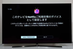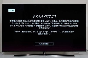 ここでは「Netflixご利用世帯を設定」もしくは「あとで」の選択肢が与えられている。試しに「あとで」を選んでみると、「よろしいですか?」という確認と、「お客様がご自身でNetflixご利用世帯を登録しなかった場合、他の場所が自動的に登録されることがあります。その場合、そのNetflixご利用世帯に紐づけられていないデバイスのアクセスが制限される場合があります。詳細はNetflix.com/Householdをご覧ください」「Netflixご利用世帯は、テレビで[ヘルプ]メニューからいつでも登録または変更できます。」とアナウンスされた。