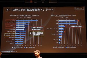 そして、1000Xシリーズは、音楽ジャンルや年代によらず楽曲が持つ魅力を素直に引き出すことを目指していると紹介。それをベースに、今回のWF-1000XM5では前モデルに比べて低域の余韻やボーカルの伸び、空間の奥行き表現などがさらに向上していると語った。