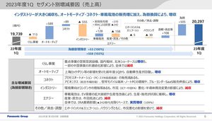2023年度第一四半期の連結業績は、売上高が2兆297億円(前年同期比103%/為替影響を除く実質ベースでは100%、IRAの影響をのぞく実質ベースで101%)。調整後営業利益は928億円(同141%)、営業利益は904億円(同142%)、当期純利益は2009億円で、パナソニック液晶ディスプレイの解散、特別精算、同社債権放棄についての取締役会決議に伴い、繰延税金資産等を1213億円計上したことにより大幅増益となっている。