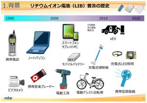 1990年代の携帯電話(ガラケー)の普及に伴い採用に広まりを見せはじめたリチウムイオン電池は、現在ではスマートフォン、モバイルバッテリー、充電式掃除機、電動アシスト自転車、電動工具、携帯型扇風機など多岐にわたる製品に採用されている。