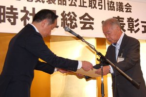 定時社員総会に続いて行われた表彰式では、支部長・副支部長を5年以上にわたり務めた支部役員のなかから9名が表彰され、代表して和歌山県支部の深見宗孝氏、滋賀県支部の坂口昌弘氏に、槙会長から表彰状と記念品が授与された。