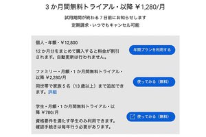 本サービスではいくつかのプランが用意されており、今回値上げが行われたのは上述した通常プランの1,180円/月から1,280円/月のほか、学割プランが680円/月から780円/月へと、それぞれ100円/月アップしている。また年間プランはこれまで11,800円/年だったところ、12,800円/年となった。