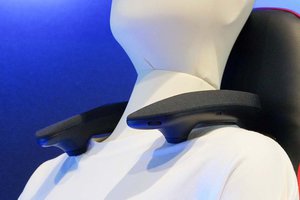 またプレーヤーの気持ちを盛り上げつつ、快適に装着できるデザインにもこだわった。同社が首にかけたとき疲れやすい理由を調査したところ、鎖骨と僧帽筋への接触を避けた方が良いということがわかったという。そのため装着時に胸元にくるフロントの足の高さを上げて、鎖骨上部の空間を拡大し、鎖骨と僧帽筋に当たりにくいよう設計されている。
