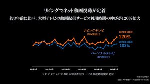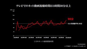 一方で、視聴されているコンテンツが大きく変化しているとコメント。テレビ番組ではなく、ネット動画の視聴時間が大きく伸びており、1日のうち1時間30分以上をテレビで視聴しているとし、「リビングルームのテレビでネット動画を観ている。視聴スタイルが大きく変わりつつあるのがデータからわかる」(石橋氏)と語った。