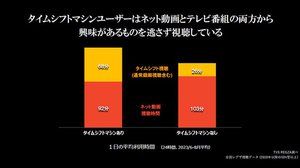 そのほか、いわゆる全録機能である「タイムシフトマシン機能」搭載モデルのユーザーと非搭載モデルのユーザーとを比べると、同機能対応モデルのユーザーのほうがテレビ番組の視聴時間が多いというデータも披露。「タイムシフトマシン機能ユーザーはネット動画感覚で録画番組を観ている」(本村氏)と解説した。