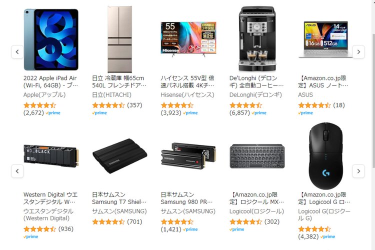 AV機器では、ハイセンスの55V型4K液晶テレビ「55E7H」、JMGOの4Kレーザープロジェクター「N1Ultra」が登場。Apple製品からも「iPad Air(2022/10.9インチ)」、「iPad mini(2021)」、「AirPods(第2世代)」など多数アイテムの割引告知がアナウンスされている。