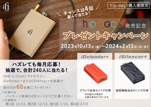 また、製品の発売に併せて購入者限定のプレゼントキャンペーンをスタート。hip-dac3を購入し、パッケージ裏面にあるQRコードよりアクセスできる特設ウェブサイトから応募したお客様の中から抽選で、グラウンドループノイズ除去アクセサリー「iDefender+」、またはバックグラウンドノイズ除去アクセサリー「iSilencer+」がプレゼントされる。