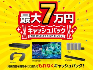 各モデルごとにキャッシュバック金額が異なり、65V型以上のブラビアが20,000円、55V型のブラビアが15,000円。セット購入対商品は4Kブルーレイディスクレコーダーが20,000円、ホームシアターシステムが25,000円、サウンドバーが10,000円、ネックスピーカーが5,000円となり、全カテゴリー商品を購入することで最大70,000円のキャッシュバックとなる。