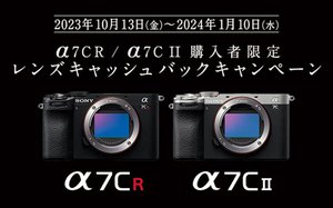 キャンペーン期間(購入期間)内に「α7CR」もしくは「α7C II」と対象レンズを同時購入し、同社指定の手続きに従い応募期間内に応募すると、最大20,000円がキャッシュバックされるというもの。キャッシュバック金額は購入レンズによってそれぞれ異なる。本体およびレンズ購入期間は2024年1月10日(水)まで、応募期間は2024年1月23日(火)まで。