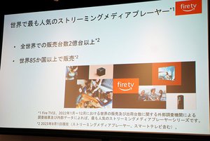 外付けの「Fire TV Cube」やスマートテレビを含む全世界でのシリーズ累計販売台数は2023年9月時点で2億台以上を突破、現在世界85ヶ国以上で販売するというFire TVシリーズを、「世界で最も人気のストリーミングメディアプレーヤーである」と強調した。