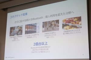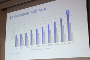 これらの分野について、ワイヤレスオーディオでは13億台以上、コンシューマーエレクトロニクス関連では16億台以上、産業向けには2億台以上の製品が今年だけで出荷される予測となっている。いずれも成長を続け、2027年にはワイヤレスオーディオが16億台以上、コンシューマーエレクトロニクス関連が29億台以上、産業向けは7億台以上になるという。
