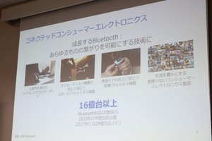 次のコネクテッドコンシューマーエレクトロニクスは、10年ほど前からフォーカスを置くようになったとのこと。コルドラップ氏は「ありとあらゆるIoTデバイス全てを繋ぐことが可能」「毎年数百の製品が接続されるようになっている」と述べているように、ワイヤレスのマウスやキーボード、フィットネス機器や健康機器、子どものおもちゃなど、今日では多くのデバイスがBluetoothに対応している。