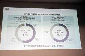 特にエアコンでは、今冬は節電のため「暖房の利用をガマンする」が54%、エアコン暖房使用時に「乾燥して困る」が62%と半数以上にのぼり、エアコン暖房をより快適にするには「節電」と「湿度」への配慮が必要と訴えた。