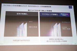 フラグシップモデル「MZ2500」シリーズは、マイクロレンズ有機ELによる「高コントラスト化」「美しい色表現」「色鮮やかな映像」「極まった黒の表現」が特長だ。実際に地上波番組やドラマを比較視聴すると、一目で分かるのが“明るさ”。人物の肌の質感もよりリアルに生々しく感じられる。より引き締まって見える黒表現による、コントラスト表現の高さも印象に残った。