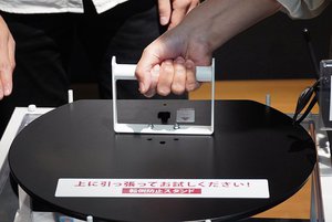昨今、地震が多い印象を受けるが、吸盤が設置面に吸着することで真空に近い状態になり、地震などの強い揺れでも倒れにくくなる「転倒防止スタンド」も体験することができた。