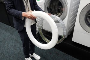 脱水での実演デモでは、パーカーやバスタオルが水を含み衣類が洗濯槽の中で偏った状態を再現する約900gの重りが、高速回転に至っても揺れを抑制し、早い運転時間で脱水を終えられることが確認できた。