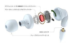 ドライバーユニットは、PEI(ポリエーテルイミド)振動板のドーム部にグラフェンをコーティングした13mmダイナミックドライバーを搭載。PEIは、同じ樹脂系素材のPETよりも密度が小さく軽量であり、内部損失が大きいため音響特性に優れるという。