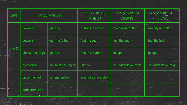 新たな機能として、イヤホンのボタン長押しでランダムに再生される「ランダムボイス機能」を搭載。“melody in motion“などのランダムボイスのセリフは、「みなさんにもっと音楽を楽しんでほしい」という想いのもと二人から提案されたとのこと。