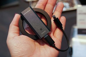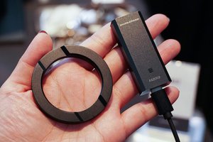 ブランド初となるUSB-DAC「AS2002」も登場。価格は3万円前後を見込んでいる。USB-CおよびLightningケーブルの2種類が付属予定で、特徴的なのは本体部分に装着して使用するリング状のパーツ。マグネット内蔵で、MagSafeのようにスマートフォンに装着できるため、持ち運びもしやすいとしている。