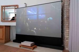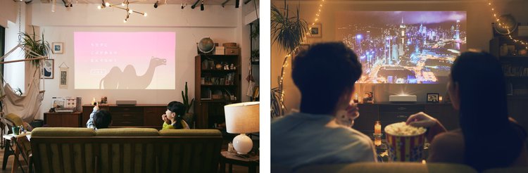 壁から24cmで100インチの映像投写が可能な超短焦点プロジェクター。天井や投写面までの距離を気にすることなく、室内のスペースを有効に活用して家庭でも圧倒的な臨場感を体験できるとアピールする。