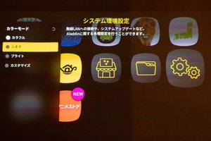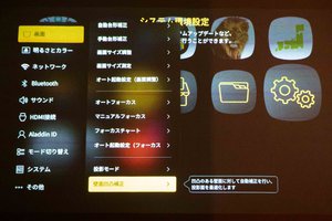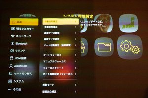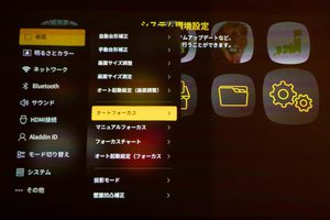 本機のメニュー画面を操作してみると、「自動台形補正」や「オートフォーカス」、「壁面凹凸補正」や「壁色自動適応」など、手軽な設置性と視聴環境への最適化を実現する機能が備わっていることを改めて確認できた。