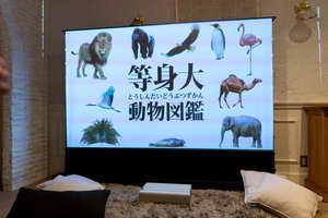 デモでは、同社のオリジナルアプリも紹介。子どもも楽しめるアプリとして、「がくしゅうポスター」や「なんでなの?」、自動読み聞かせ機能も備えた「せかいのえほん」やプロジェクターによる大画面映像との親和性が高い「とうしんだいどうぶつずかん<等身大動物図鑑>」などがインストールされている。同社のゲームアプリであり、Nintendo Switchソフトの国内外累計ダウンロード数が1カ月半で300万ダウンロードを記録した「スイカゲーム」も楽しむことができる。