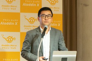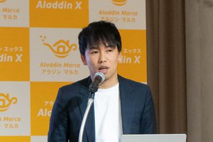 Aladdin X社の岡本岳洋氏は、製品としての“存在感のなさ”、“大画面”の映像、自然とひとが集まる“豊かな空間”、これら3つのキーワードをAladdin Xが実現する“魔法”としており、「みんな、あつまる、ひとつになる。」というコンセプトを基に、Aladdin X社が製品開発に取り組んでいることをアピールする。