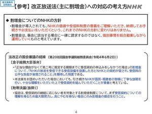 なお、割増金の運用については、国会の附帯決議でも、受信契約についての理解を得るため最大限努力しつつ、個別事情に配慮し、適切な対応を行うことをNHKに求めている。NHKではこれを念頭に、今後も対象となる自由に該当する場合に一律に請求するのではなく、個別事情を総合勘案しながら運用していくとし、「今後も公平負担の実現に向けた取組を進めていく」とコメントしている。