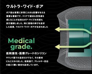 ラインナップはS/M/Lの3サイズに加え、各サイズ1ペアずつがセットになった「コンボ」の計4タイプを用意。素材には低刺激でアレルギー反応が起こりづらいという医療グレードシリコンを採用する。軸穴の直径は基部が4mm、先端部が8.3mm。イヤーピース外径はSサイズが10.9mm、Mサイズが12mm、Lサイズが13mmとなる。